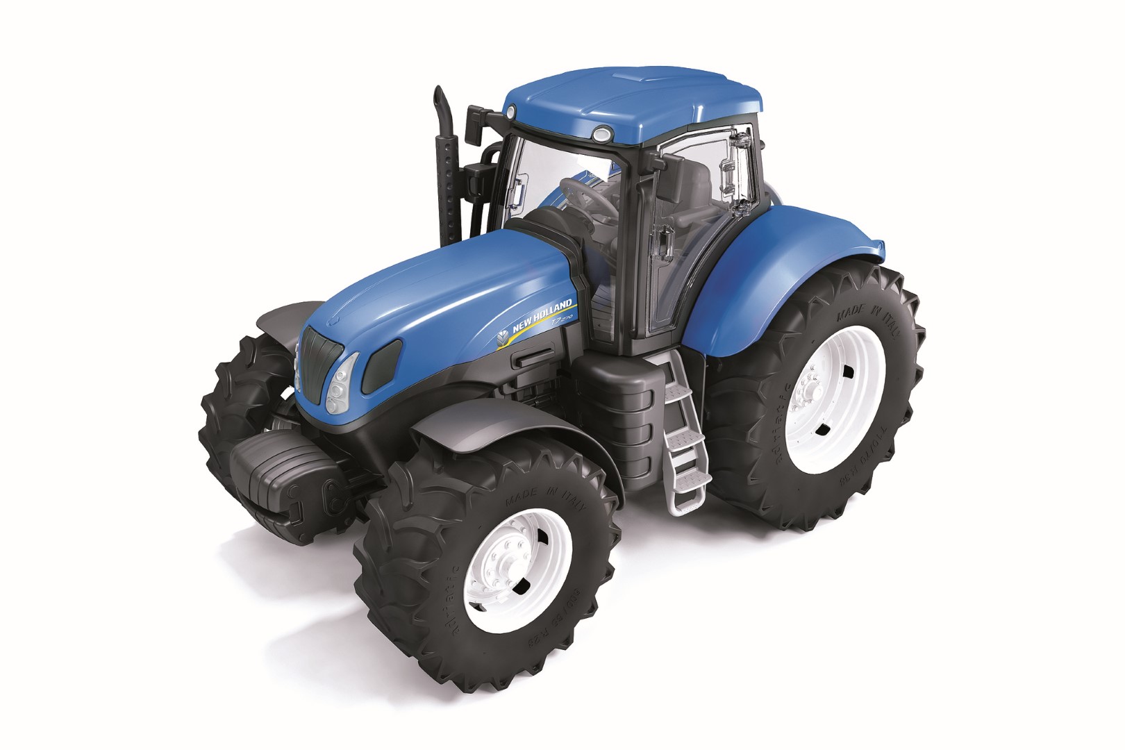 Traktor z serii New Holland. Umożliwia sterowanie przednią osią za pomocą kierownicy z tyłu maszyny. Posiada aktywne przednie zawieszenie oraz otwierane drzwi w kabinie. Koła wykonane są z prawdziwej gumy.