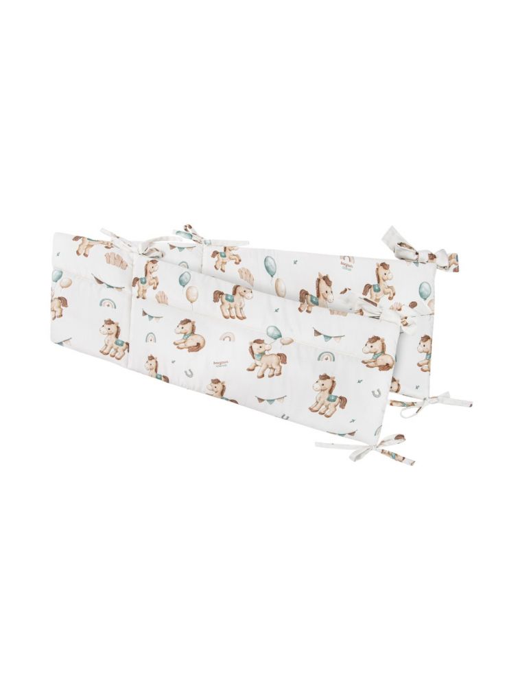 Produkt jest wypełniony włókniną puszystą silikonową, posiada liczne troczki do zamocowania na szczebelkach łóżeczka.