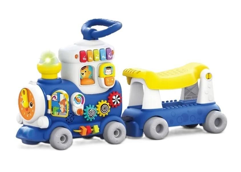 Kto ma ochotę na muzyczną podróż z udziałem aktywnych elementów, światełka i zręcznościowych niespodzianek? Niebieściutki jeździk - pociąg zaprasza na przejażdżkę, oferując aż 4 różne sposoby zabawy: po pierwsze, usiądź wygodnie na wagoniku i odpychaj się nóżkami (jeździk), po drugie, odczep wagonik i prowadź ciuchcię, idąc za nią (pchacz), po trzecie, ciągnij za sobą odczepiony wcześniej wagonik i wreszcie po czwarte, usiądź przy ciuchci i odkryj wszystkie niespodzianki, jakie w sobie kryje. Znajdziemy tu zegar, ruchome koraliki, książeczkę, kolorowe trybiki, a nawet pianinko! Pociąg wyposażony został w melodie i wesołe dźwięki, które umilą zabawę.