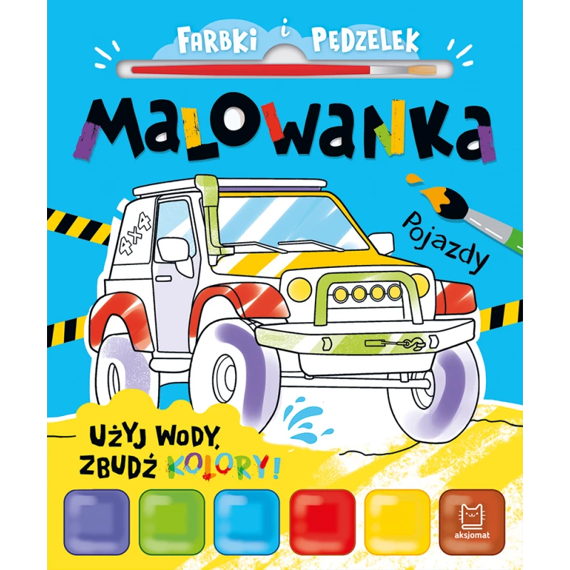 Malowanka z pędzelkiem i farbkami to propozycja dla małych artystów. Na każdej stronie znajduje się rysunek do pokolorowania oraz paleta z farbami. Dołączony pędzelek wystarczy zamoczyć w wodzie, wybrać kolor farbki i można zacząć kolorowanie. Perforacja ułatwia wyrywanie rysunków z książki. W malowance znajdują się następujące ilustracje do kolorowania: wóz strażacki, motocykl ścigacz, monster truck, samochód sportowy, dżip terenowy, traktor, buggy, kamper, quad, walec, duża wywrotka, samochód WRC, samochód dostawczy, chopper, autokar, kombajn, czołg, koparkoładowarka, skuter śnieżny, motocykl żużlowy. Ciekawa tematyka i odpowiednie dla dzieci rysunki bardzo różnych pojazdów oraz dołączony pędzelek i paleta z farbami zachęcą dzieci do pracy z książeczką. Zapraszamy do świata kolorów – użyj wody, zbudź kolory!