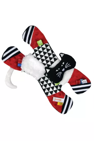 Kot Milutek wypełniony jest szeleszczącą folią, której delikatny dźwięk przykuwa uwagę najmłodszych, dostarczając bodźców słuchowych. Delikatny szelest uspokaja maluszka, ponieważ kojarzy mu się z dźwiękami, które słyszał będąc w brzuszku mamy. Ogonek, miękka, odstająca główka kotka i kolorowe metki zachęcają dzieci do chwytania, wspomagają rozwój motoryki małej i koordynacji ręka-oko. Czerwone wstawki uszyte są z ulubionego materiału dzieci, miękkiej i przyjemnej tkaniny Minky. Szeleścik jest lekki i łatwo się go trzyma dlatego może towarzyszyć dziecku już od pierwszych chwil, zarówno w łóżeczku, jak i na spacerze.