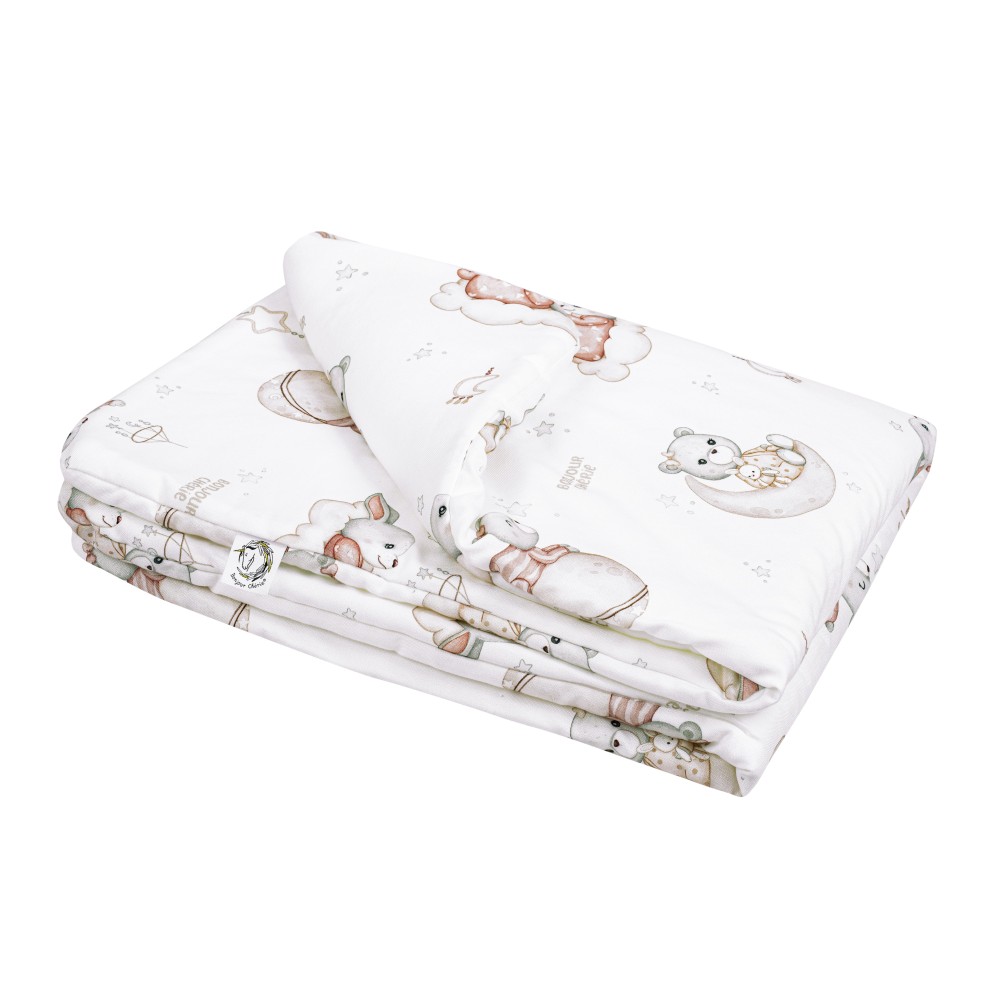 Środek kołderki wypełniony jest antyalergiczną włókniną wysokopuszystą silikonową. Zapewnia ona dziecku ciepło oraz wygodę podczas użytkowania. Kołderka idealnie sprawdza się do łóżeczka, na popołudniową drzemkę w przedszkolu, a także jako ulubiona kołderka na wszelkie wyjazdy lub jako mięciutka mata dla dziecka, z uwagi na swoją wielkość również jako narzutka na łóżko.