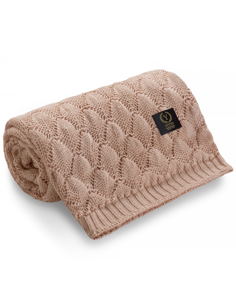 Mięciutki, ażurowy kocyk dziany marki YOSOY wykonany z kompozycji przędzy bambusowej i bawełnianej, dzięki czemu jest w 100% bezpieczny dla delikatnej skóry niemowlaka.