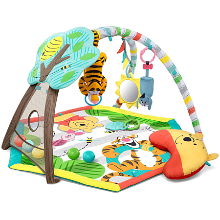Pobudź wyobraźnię swojego dziecka zabawą i stymulacją słuchową, pociągając za przenośną zabawkę w kształcie tygrysa, aby uruchomić ponad 20 minut muzyki. W zestawie znajduje się również pacynka Kłapouchy, która zachęca do wspólnej zabawy podczas opowiadania historii, bezpieczne lusterko do samopoznania oraz gryzak, który ukoi ból dziąseł. Dotykowe i szeleszczące chorągiewki zawieszone na pałąku z zabawkami wprowadzają dziecko w świat stymulacji sensorycznej. Dodatkowo, możesz rozwijać jego zdolności motoryczne, wrzucając 5 kolorowych piłek do otworu w pniu drzewa, aby zabrać je ze sobą. Ergonomiczna poduszka wspiera dziecko podczas zabawy na brzuszku.