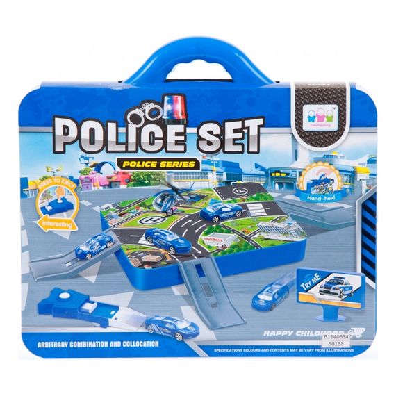 Zawartość: zestawu 1 x parking jednopoziomowy,1 x walizka do przechowywania całości zestawu, 1 x samochód policyjny,1 x plansza-plan parkingu, 3 x tor umożliwiający wjazd/wyjazd z parkingu, 1x sterownik do napędzania samochodów, 1 x bilbord z opisem parkingu.