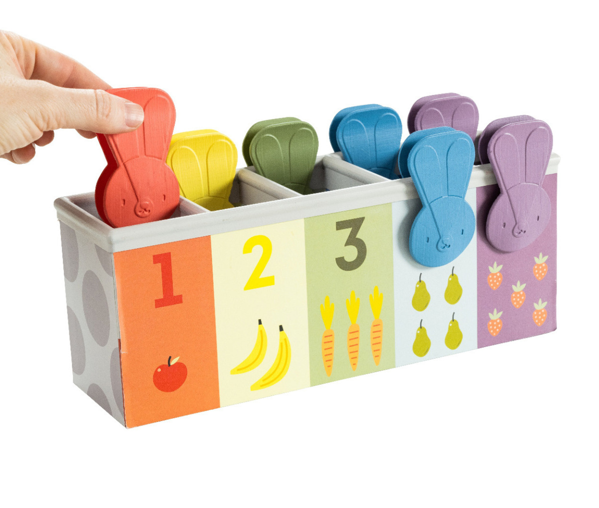 Maluchy uczą się precyzyjnego chwytania, przyczepiając króliczki do krawędzi pudełka i wkładając je z powrotem. To świetny sposób na rozwój małych rączek i koordynacji ruchowej.