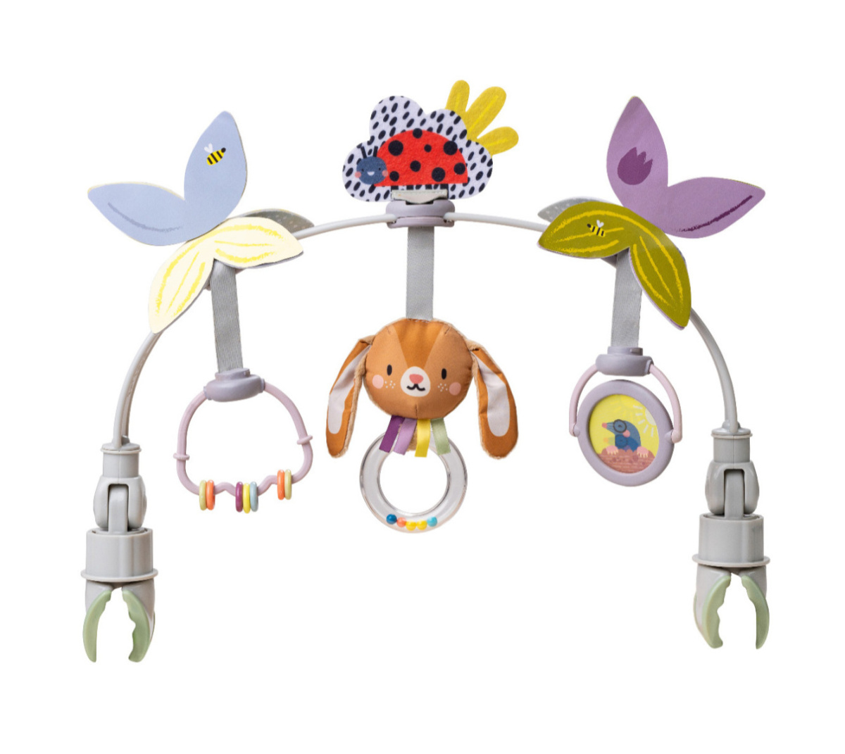 Pałąk z zawieszkami rozwija zmysły i motorykę dziecka. Zabawki takie jak motyl 🦋, królik z szeleszczącymi uszami 🐰 i grzechotki zapewniają angażującą zabawę w różnych fazach rozwoju 👶.
