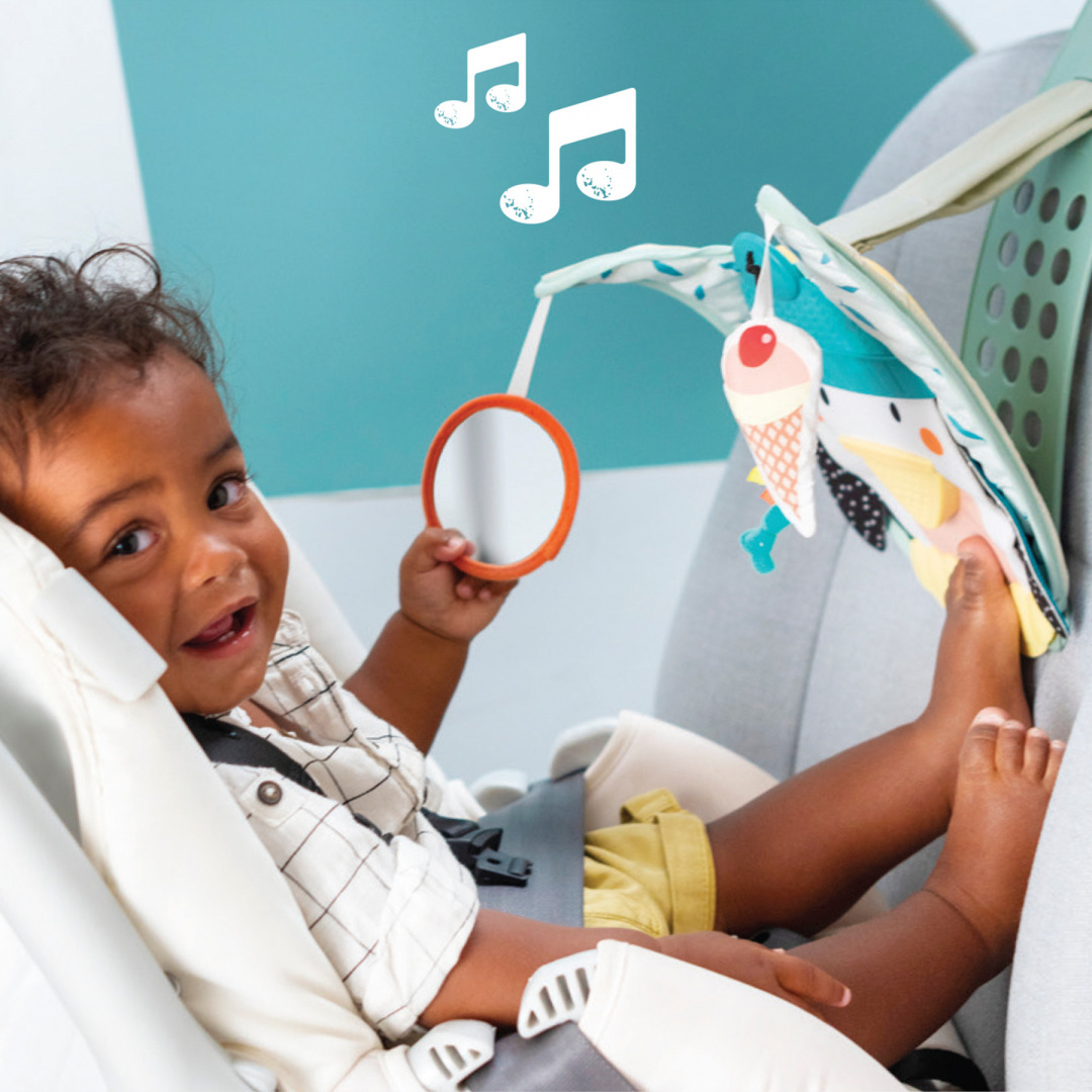 Wielozmysłowe elementy aktywności: Miękkie, grzechoczące zabawki 🧸, w tym bezpieczne lusterko i grzechotka w kształcie lodów 🍦, stymulują rozwój zmysłów i zachęcają do chwytania ✋.