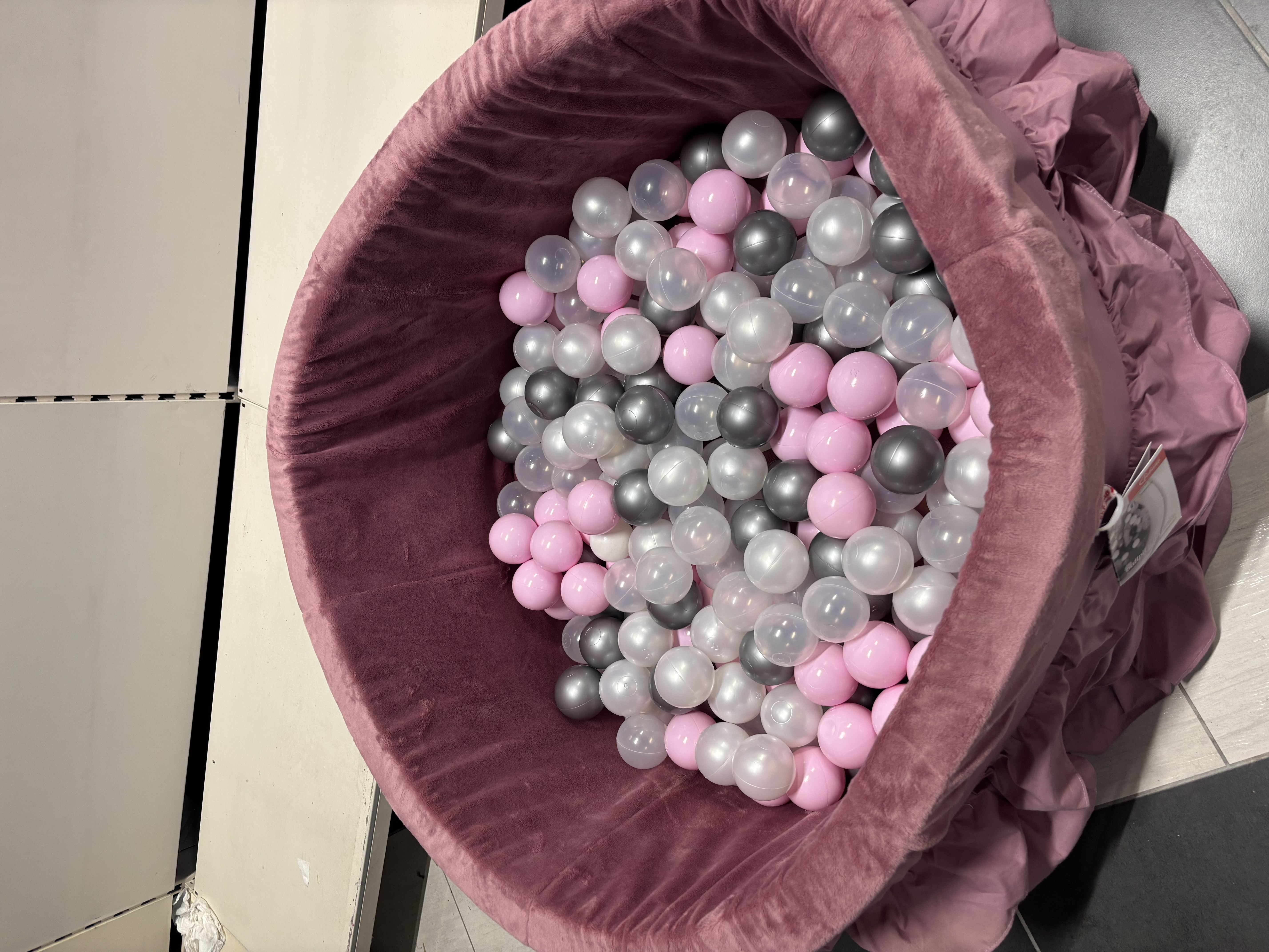 Stylowy i miękki suchy basen marki Bobono o średnicy 90 cm, idealny do zabawy dla najmłodszych. Basen pokryty jest przyjemnym w dotyku materiałem w kolorze pudrowego różu, ozdobiony elegancką falbaną. W zestawie znajdują się kolorowe piłeczki w odcieniach różu, bieli, szarości i przezroczystego plastiku. Produkt doskonale sprawdzi się w pokoju dziecięcym, zapewniając bezpieczną i kreatywną zabawę.