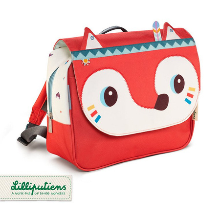 Uroczy i poręczny tornister z kolekcji Lisiczka Alice belgijskiej marki Lilliputiens. Funkcjonalny, lekki i wygodny, idealny do przedszkola czy pierwszej klasy szkoły, plecak pomieści zeszyty czy książki formatu A4. Ma szeroką, biało-pomarańczową komorę główną w indiańskie motywy, zapinaną na jasnoniebieski suwak oraz sporą klapę na rzep z pyszczkiem Lisiczki Alice w pióropuszu, która okrywa również mniejszą kieszeń zewnętrzną. Wewnątrz komory głównej znajduje się dodatkowa kieszonka i przegroda na butelkę. Tornister posiada dość szerokie, u góry miękkie i grubsze szelki z regulacją długości. Z przodu na klatce piersiowej ma dodatkowy pasek stabilizujący i odciążający plecy, zapinany na łatwy w obsłudze zatrzask. W górnej części znajduje się uchwyt do zawieszenia, np. na haczyku w szatni, a na wewnętrznej stronie klapy – wizytówka, na której można zapisać imię dziecka i numer kontaktowy rodzica. Paski są w kolorze grafitowym, a zatrzask i blokady regulacji – turkusowe. Zarówno z przodu tornistra, jak i na szelkach, znajdują się elementy odblaskowe. Plecak uszyto z wysokiej jakości materiałów, miękkich, łatwych do czyszczenia i odpornych na wilgoć. Jest perfekcyjnie wykończony, z dbałością o każdy szczegół i w pełni bezpieczny dla dziecka.