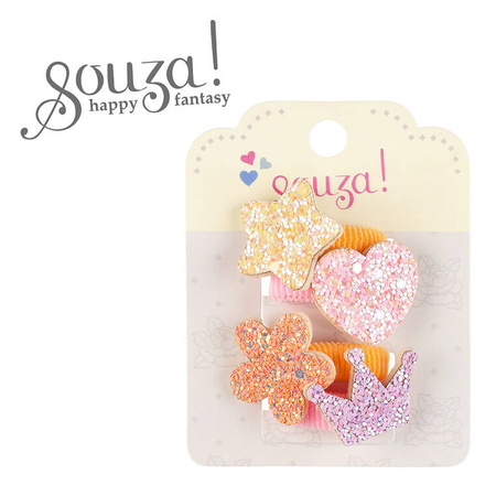 Komplet czterech gumek do włosów z brokatowymi kształtami Carolina holenderskiej marki Souza! Na każdej z nich znajdują się aplikacje w różnych kolorach i kształtach: żółta gwiazda, jasnoróżowe serce, pomarańczowy kwiat i jasnofioletowa korona. Gumki są solidne, typu frotte, dwie są ciemnożółte i dwie różowe. Idealne zarówno do tworzenia fryzur na przyjęcia, jak i na co dzień. Nadają się także na prezent.