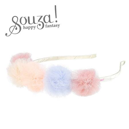 Opaska z tiulowymi pomponami Marlena holenderskiej marki Souza! Obciągniętą perłową satynową wstążką metalową opaskę (0,5 cm szerokości) zdobi 5 pomponów z siateczkowego tiulu w kolorach: jasnoróżowym, jasnobrzoskwiniowym i jasnoniebieskim. Opaska jest lekka, delikatna i przyjemna w noszeniu (nie uciska). Idealna zarówno na przyjęcia, jak i na co dzień. Sprawdzi się także jako stylowy prezent.