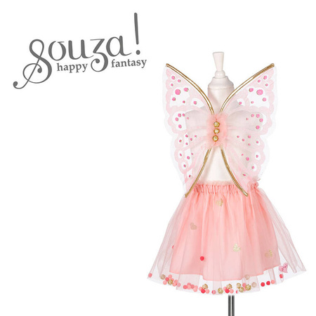 Kostium spódniczka ze skrzydłami elfa Lusianne holenderskiej marki Souza! to przepiękne, kunsztownie wykonane przebranie dla dziewczynki. Spódniczka ma klasyczny rozkloszowany krój i gumkę w pasie. Zachwyca dbałością o detale. Składa się z gładkiej różowej podszewki i dwóch warstw tiulu, wewnątrz których umieszczone są kolorowe mini-pomponiki. Tę wierzchnią zdobią również brokatowe serduszka. W skład zestawu wchodzą także półprzeźroczyste skrzydła elfa z różowymi brokatowymi wzorami i złotymi detalami. Można je nosić razem ze spódniczką lub osobno. Zakładane są na wygodne gumowane ramiona. Strój jest efektowny i komfortowy. Idealny na wszelkie przyjęcia, bale przebierańców czy Sylwestra. Sprawdzi się także jako prezent.