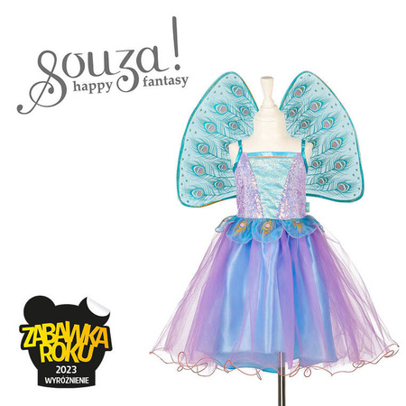 Kostium sukienka ze skrzydłami w pawie pióra Tamara holenderskiej marki Souza! to przepiękne, kunsztownie wykonane przebranie dla dziewczynki. Sukienka ma klasyczny krój na ramiączkach i gumkę w pasie. Jest miękka i wsuwana przez głowę. Zachwyca dbałością o detale. Góra tej turkusowo-fioletowej sukienki jest dwustronna: z przodu ma boczne pasy z fioletowych cekinów, z tyłu jest gładka, satynowa i turkusowa. Dół stanowi kilkuwarstwowa spódniczka z niebieską podszewką i wielobarwnym (turkusowo-fioletowym) tiulem. Z niego jest także wykonane obszycie w talii z haftowanymi aplikacjami – pawimi oczkami na każdym elemencie. W skład zestawu wchodzą także półprzeźroczyste skrzydła, również zdobione pawimi piórami i ze złotą obwódką. Można je nosić razem z sukienką lub osobno. Zakładane są na wygodne gumowane złote ramiona. Strój jest efektowny i komfortowy do noszenia. To idealne przebranie na bal przebierańców czy Sylwestra. Sprawdzi się także jako prezent.