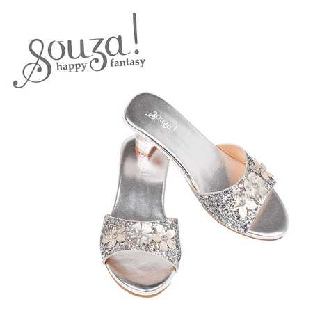 Pantofelki/klapki na obcasie Mariona holenderskiej marki Souza! to piękne, kunsztownie wykonane buciki, np. do sukienki wizytowej, przebrania księżniczki, elfa lub wróżki. Zachwycają dbałością o detale. Obuwie zrobione jest ze skóropodobnego, przyjemnego w dotyku materiału w srebrnym kolorze. W transparentnym, niewysokim (4 cm) obcasie zatopione są srebrne kwiaty. Kwiaty i kryształki zdobią także brokatowy front butków. Klapki posiadają gumową podeszwę, są antypoślizgowe, ciche i nie rysują powierzchni. Komfortowe do noszenia i łatwe do czyszczenia wilgotną szmatką. Idealne jako dodatek do stroju na każde przyjęcie, bal przebierańców czy Sylwestra. Sprawdzą się także jako prezent.