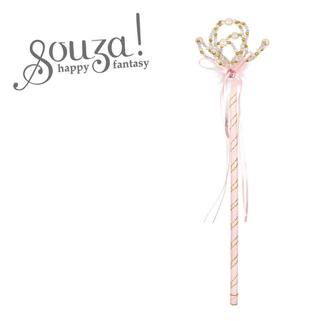 Różdżka/berło z perełkami Alexandra holenderskiej marki Souza! Obciągnięta jest jasnoróżową satynową tkaniną i taką samą satynową wstążką ze złotymi brzegami. U góry zdobią ją pętle z białych, złotych i jasnoróżowych perełek różnej wielkości, kokardka z cienkiej tasiemki, tiul i kryształek. Ma 40 cm długości, jest poręczna i lekka. Stanowi idealny dodatek do kostiumu księżniczki lub wróżki. Sprawdzi się także jako prezent.