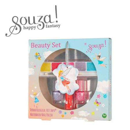 Zestaw kosmetyków do makijażu dla dzieci Elf holenderskiej marki Souza! zawiera 2 brokatowe lakiery do paznokci (różowy i liliowy, po 5 ml), pomadkę oraz 5 brokatowych cieni do powiek: żółty, czerwony, różowy, liliowy i turkusowy. W zestawie znajduje się też podwójny miękki (z gąbeczkami) aplikator. Pomadka ma słodki waniliowy smak. Kosmetyki zostały stworzone na bazie wody i naturalnych minerałów. Są przetestowane dermatologicznie, w pełni bezpieczne, nie uczulają i nie podrażniają skóry. Lakiery tworzą na płytce warstwę peel-off, dzięki czemu bez trudu usuwa się je z paznokci (jak naklejki). Błyszczyk i cienie łatwo się zmywa ciepłą wodą z mydłem. Idealne na przyjęcia, urodzinki, zabawę w salon kosmetyczny oraz jako stylowy prezent. Zestaw zapakowany jest w urocze kartonowe pudełko z okienkami i postacią elfki.