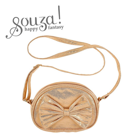 Torebka na ramię dla dzieci Cheline holenderskiej marki Souza! jest poręczna i całkiem pojemna, zapinana na suwak, z długim (ok. 50 cm) wąskim paskiem do przewieszenia przez ramię. Ma zaokrąglony u góry kształt, metaliczny złoty materiał i kokardę na przodzie w kolorze torebki. Pomieści niezbędne drobiazgi. Idealna jako dodatek do stroju wizytowego, np. na przyjęcia, na wyjazdy, jak i do noszenia na co dzień. Nadaje się także na prezent.