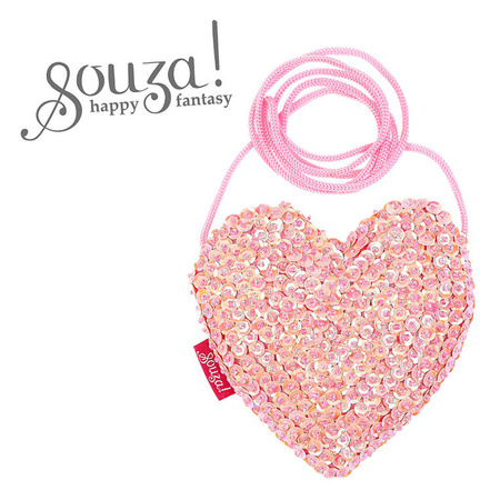 Torebka dla dzieci Emma holenderskiej marki Souza! ma kształt serca i pokryta jest jasnoróżowymi cekinami. Zapinana na suwak, z długim (ok. 50 cm) miękkim sznurkiem do przewieszenia przez ramię. Pomieści niezbędne drobiazgi. Idealna jako dodatek do stroju wizytowego, np. na przyjęcia, jak i do noszenia na co dzień. Nadaje się także na prezent.