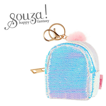 Portfelik w kształcie mini-plecaka z breloczkiem Lanette holenderskiej marki Souza! Brelok z metalowym kółkiem i karabińczykiem (np. na klucze) i jasnoróżowym pomponem. Portfel zapinany jest na suwak i pokryty niebieskimi holograficznymi cekinami. Pomieści kieszonkowe i inne niezbędne drobiazgi. Idealny do noszenia na co dzień, np. przy spodniach lub plecaku. Nadaje się także na prezent.