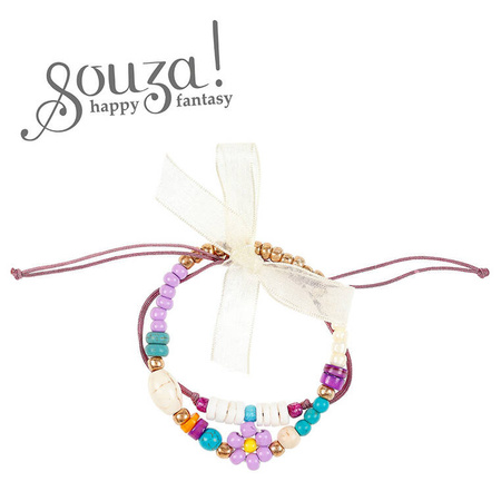 Bransoletka 2w1 Phileine holenderskiej marki Souza! składa się z dwóch bransoletek (15 cm) – jedna jest z koralików w wielu kolorach, wśród których dominują odcienie fioletu, złota i złamanej bieli, na środku ułożone są one w kwiatek, w drugiej - kilka koralików nawleczonych jest na fioletowy sznureczek zaciskowy. Bransoletki związane są białą tiulową kokardką. Koraliki nawleczone są na elastyczną silikonową gumkę, dzięki czemu są wygodne do nakładania. Biżuteria jest lekka, delikatna, nietoksyczna i nie podrażnia skóry. Idealna zarówno na przyjęcia, jak i na co dzień. Sprawdzi się także jako stylowy prezent.