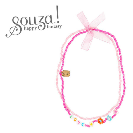 Naszyjnik 2w1 Diandra holenderskiej marki Souza! składa się z dwóch rzędów koralików o długości 36 cm – jasno i ciemno różowego. Na ciemniejszym znajdują się kolorowe koralikowe kwiatki i ułożony z kosteczek z literkami napis LOVE, jak również złota zawieszka – blaszka z logo marki. Naszyjniki związane są różową kokardką. Koraliki nawleczone są na elastyczną silikonową gumkę, dzięki czemu są wygodne do nakładania. Biżuteria jest lekka, delikatna, nietoksyczna i nie podrażnia skóry. Idealna zarówno na przyjęcia, jak i na co dzień. Sprawdzi się także jako stylowy prezent.