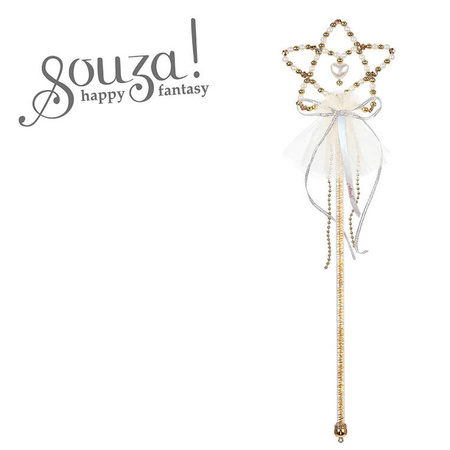 Różdżka z perełkami Coralina holenderskiej marki Souza! Urokliwa różdżka z białymi i złotymi detalami. U góry zdobią ją perełki (na przemian białe i złote), układające się w kształt gwiazdy z perłowym serduszkiem w środku, poniżej zaś biały tiul, srebrna kokardka z cienkiej tasiemki oraz sznur ze złotych koralików. Ma 39 cm długości, jest poręczna i lekka. Stanowi idealny dodatek do kostiumu księżniczki, syrenki czy wróżki. Sprawdzi się także jako prezent.