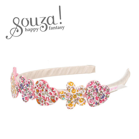 Opaska z kwiatowymi elementami Eliana holenderskiej marki Souza! Obciągniętą perłową wstążką opaskę zdobi 6 aplikacji (serduszka i kwiaty), pokrytych tkaninami w kwiatowe wzory. Opaska jest lekka, delikatna i przyjemna w noszeniu (ma optymalną szerokość – 1 cm – i nie uciska). Idealna zarówno na przyjęcia, jak i na co dzień. Sprawdzi się także jako stylowy prezent.