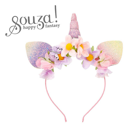 Opaska z kwiatami, rogiem i uszami jednorożca holenderskiej marki Souza! Obciągniętą tkaniną opaskę zdobią spore materiałowe kwiaty z żółtymi pluszowymi środkami oraz brokatowe uszy i róg jednorożca w odcieniach różu i fioletu. Opaska jest lekka, delikatna i przyjemna w noszeniu (ma optymalną szerokość – 0,5 cm – i nie uciska). Idealna zarówno na przyjęcia, jak i na co dzień. Sprawdzi się także jako stylowy prezent.