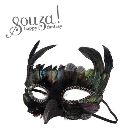 Maska Kruk holenderskiej marki Souza! wykonana z prawdziwych gęsich piór. Zachwyca detalami, m.in. futerkiem, naturalnymi przebarwieniami, wykończeniem wokół oczu z tasiemki z ozdobną srebrną nicią oraz sporym połyskującym dziobem. Maska jest łatwa do zakładania i zdejmowania dzięki gumce. Stanowi idealny dodatek do kostiumu ptaka, na bal przebierańców, Halloween, Sylwestra czy tematyczne urodzinki. Sprawdzi się także jako prezent.