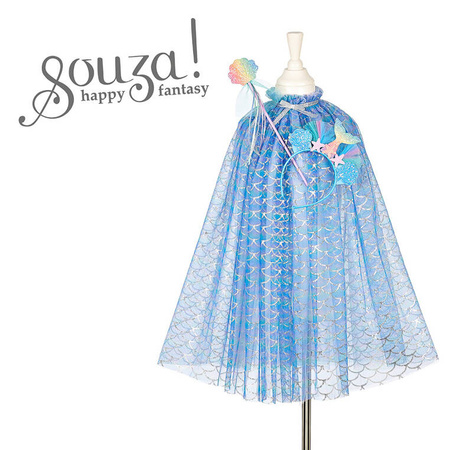 Kostium peleryna z akcesoriami (opaską i różdżką) syrenka Marlya holenderskiej marki Souza! to przepiękne, kunsztownie wykonane przebranie dla dziewczynki. Peleryna zachwyca dbałością o detale. Jest efektowna, z niebieskiego tiulu z połyskującym nadrukiem wzoru, imitującego syrenie łuski. Zapinana pod szyją na nap i obszyta srebrzącą się tasiemką wokół stojącego kołnierzyka. W zestawie z peleryną znajduje się też lekka opaska, obciągnięta niebieską tkaniną i zdobiona sporymi aplikacjami: ogonem, gwiazdkami czy muszlami, jak również syrenia różdżka – fioletowa z upięciem z niebieskiego tiulu oraz brokatową muszlą w odcieniach tęczy. Zestaw stanowi idealne uzupełnienie stroju syrenki lub samodzielny kostium na bal przebierańców czy Sylwestra. Sprawdzi się także jako prezent.