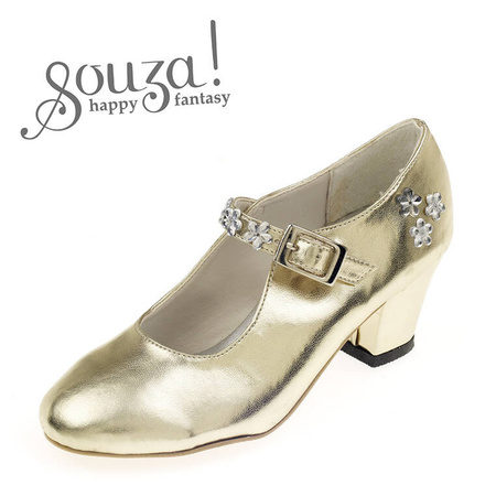 Pantofelki na obcasie Sabine holenderskiej marki Souza! to piękne, kunsztownie wykonane buciki, np. do sukienki wizytowej, przebrania księżniczki, elfa lub wróżki. Zachwycają dbałością o detale. Obuwie zrobione jest ze skóropodobnego, przyjemnego w dotyku metalicznego materiału w kolorze złotym. Jest zapinane na pasek z boczną sprzączką. Ma zaokrąglony, komfortowy nosek, szeroki, niewysoki (4 cm) obcas i kwiatowe aplikacje – trzy na boku bucika i trzy na pasku. Buty posiadają gumową podeszwę, są antypoślizgowe, ciche i nie rysują powierzchni.