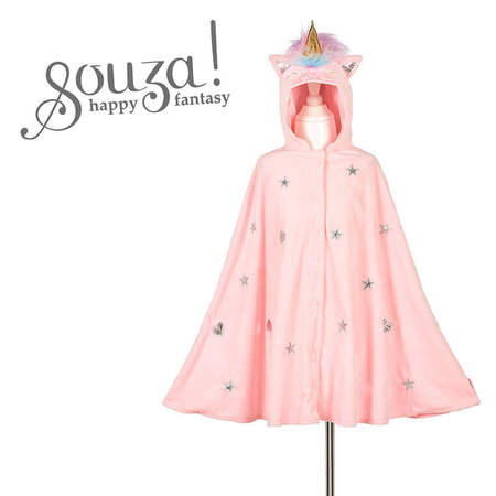 Kostium peleryna z kapturem Jednorożec holenderskiej marki Souza! to przepiękne przebranie dla dziewczynki. Jest wykonana z jasnoróżowego aksamitu z naszytymi srebrnymi aplikacjami. Na kapturze ma uszka ze srebrnym środkiem, bujną tęczową grzywę i duży złoty róg. Zapinana na solidne rzepy.