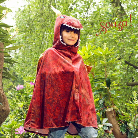 Kostium peleryna Red dragon z dużym zabudowanym kapturem, tworzącym jednocześnie maskę smoka holenderskiej marki Souza! to przepiękne przebranie dla chłopca. Ma krótszą warstwę zewnętrzną – złote skrzydła, a wzdłuż całego grzbietu i na ogonie złote wypustki 3D. Posiada także złote uszy/rogi, uzębioną szczękę i gadzie oczy. Nadruk na tkaninie imituje ognistą smoczą skórę. Zapinany na solidne rzepy.