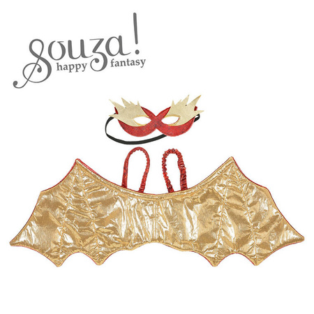 Zestaw akcesoriów: miękkie skrzydła i maska Red dragon holenderskiej marki Souza! Szerokie złote skrzydła wykonane są od spodu z fakturowanej czerwonej tkaniny, imitującej smoczą skórę. Czerwona maska ma złote aplikacje ogników.