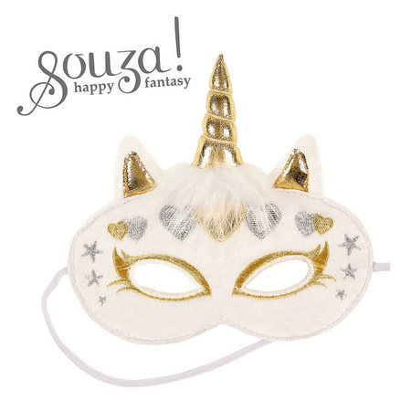 Miękka biała maska Jednorożca holenderskiej marki Souza! Wykonana z przyjemnego futerka, ze złotymi i srebrnymi aplikacjami, uszkami, białą grzywką, złotym rogiem i haftowaniami wokół oczu.