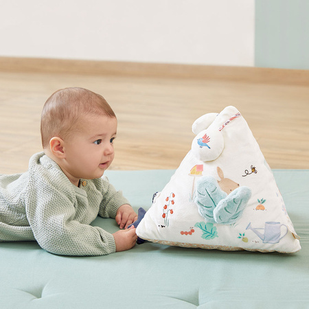 Miękka, sensoryczna piramida francuskiej marki KALOO to idealna zabawka dla Twojego maluszka, bezpieczna już od pierwszych dni życia. Każda ze stron piramidy kryje inne aktywności stymulujące zmysły: wzrok, dotyk, słuch oraz zdolności motoryczne maluszka – 4 rodzaje grzechotek, okienko peek a boo, elementy szeleszczące przy pocieraniu oraz kieszonkę. Dodatkowo każdą z trzech ścianek zdobi inna ciekawa historia zachęcająca do snucia własnych opowieści – o króliczku w ogrodzie, o zielonej myszce i o mrugających gwiazdkach.