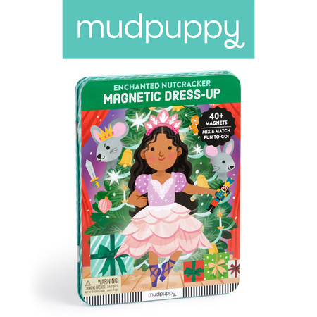 Magnetyczna układanka z zestawem magnesów Zaczarowany dziadek do orzechów amerykańskiej marki MUDPUPPY to wyjątkowo kreatywna zabawka dla dzieci od 4. roku życia. Zabawka ma format metalowego zamykanego pudełka. Na dwóch magnetycznych planszach wewnątrz pudełka znajdują się postacie baletnic na tle pięknej świątecznej scenerii. Można na nich umieszczać magnesy - elementy garderoby oraz scenografii, w tym takie z motywem dziadka do orzechów (w zestawie znajdują się 3 arkusze z ponad 40 magnesami).