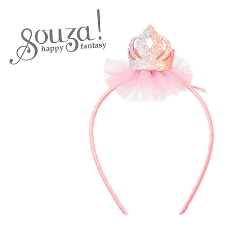 Opaska z mini-koroną Yris holenderskiej marki Souza! jest owinięta różową wstążką. U góry zdobi ją tiulowe upięcie i trójwymiarowa brokatowa korona. Jest lekka, delikatna i przyjemna w noszeniu (ma optymalną szerokość – 1 cm – i nie uciska).
