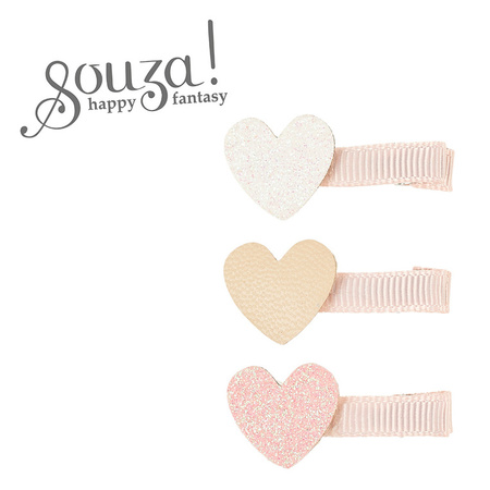 Komplet trzech spinek do włosów z sercami Bracha holenderskiej marki Souza! Na każdej z nich znajduje się inna aplikacja: brokatowe biała i jasnoróżowa oraz kremowa z ekoskóry. Metalowa część spinek pokryta jest materiałem (rypsową wstążką). Ząbkowane zaciski sprawiają, że ozdoby stabilnie trzymają się włosów.
