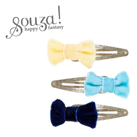 Komplet trzech spinek do włosów Olda holenderskiej marki Souza! Na każdej z nich znajduje się aksamitna kokardka: jasnożółta, jasnoniebieska i granatowa. Mają złote, brokatowe, metalowe zaciski na klik. Stabilnie trzymają się włosów.