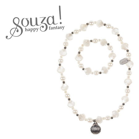 Naszyjnik i bransoletka Famke holenderskiej marki Souza! to zestaw biżuterii z perłowych koralików i elementów w kształcie muszelek. Bransoletka ma 14 cm obwodu, a naszyjnik – 40 cm i srebrną zawieszkę-muszelkę. Są elastyczne i wygodne do nakładania. Biżuteria jest nietoksyczna i nie podrażnia skóry. Idealna zarówno na przyjęcia, jak i do noszenia na co dzień. Sprawdzi się także jako stylowy prezent.