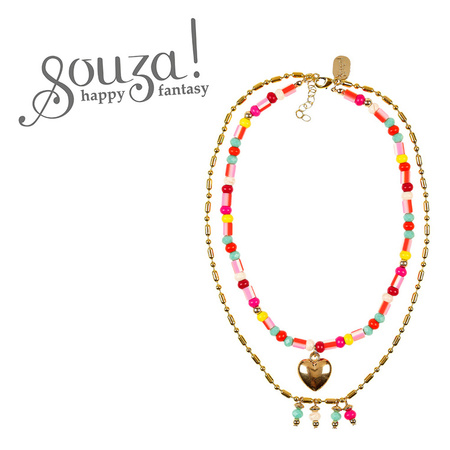 Naszyjnik 2w1 Syta holenderskiej marki Souza! składa się ze złotego łańcuszka i rzędu sporych kolorowych koralików z zawieszką w kształcie serca. Ma 42 cm długości i regulowane zapięcie. Jest wygodny do nakładania. Biżuteria jest nietoksyczna i nie podrażnia skóry. Idealna zarówno na przyjęcia, jak i do noszenia na co dzień. Sprawdzi się także jako stylowy prezent.