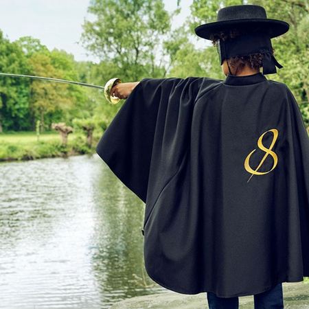 Kostium peleryna z maską holenderskiej marki Souza! to przepiękne, kunsztownie wykonane przebranie, które nawiązuje do postaci Zorro (tj. Diego de la Vegi). Zachwyca dbałością o detale. Peleryna ma rozkloszowany krój, głęboki czarny kolor i elegancko wyszywany złoty znak „&” na plecach. Ma stójkę, jest zapinana na rzepy, miękka i komfortowa do noszenia. W zestawie znajduje się również szeroka czarna maska na oczy z regulacją na rzep. To idealny strój na bal przebierańców, Sylwestra czy urodziny. Doskonale sprawdzi się także jako prezent.