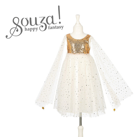 Sukienka wizytowa z długimi rękawami Dorianne holenderskiej marki Souza! to przepiękne, kunsztownie wykonane ubranie dla dziewczynki. Zachwyca dbałością o detale, ma klasyczny krój i gumkę w pasie, która zapewnia komfort noszenia. Góra sukienki wykonana jest z błyszczących, złotych cekinów, natomiast wyjątkowo długie, rozszerzane rękawy oraz spódniczka uszyte są z kremowego tiulu z drobnym wzorem w złote gwiazdeczki, co nadaje całości bajkowego charakteru. To idealna sukienka na wyjątkowe okazje i wszelkie przyjęcia (np. wesele czy urodziny), bale przebierańców czy Sylwestra. Sprawdzi się także jako prezent.