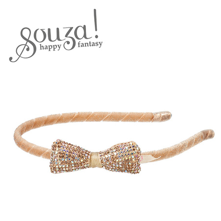 Opaska ze złotą kokardą Francis holenderskiej marki Souza! Obciągniętą aksamitną, połyskującą wstążką, cienką (0,8 cm), metalową opaskę zdobi złota kokardka z cekinami. Opaska jest lekka, delikatna i przyjemna w noszeniu (nie uciska). Idealna zarówno na przyjęcia, jak i na co dzień. Sprawdzi się także jako stylowy prezent.