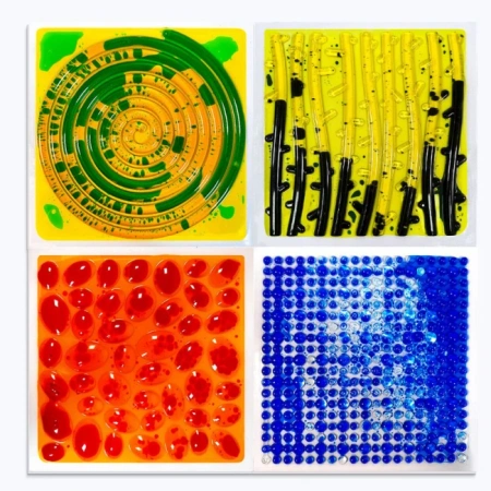 - W zestawie: 4 kolorowe płytki sensoryczne z cieczą
