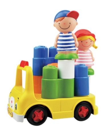 Kolorowy zestaw składający się z samochodzika na zdalne sterowanie z pilotem, klocków z serii Popboblocs oraz postaci Julii i Wayna.