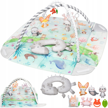 8 starannie dobranych zabawek rozwijających zmysły i koordynację, w tym poduszka ułatwiająca leżenie na brzuszku