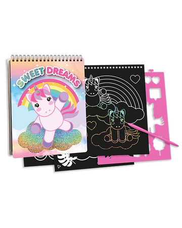 Zestaw kreatywny zdrapywanka z szablonami z motywem Sweet Dreams to wspaniała propozycja dla dzieci, które chcą rozwijać zdolności manualne.